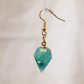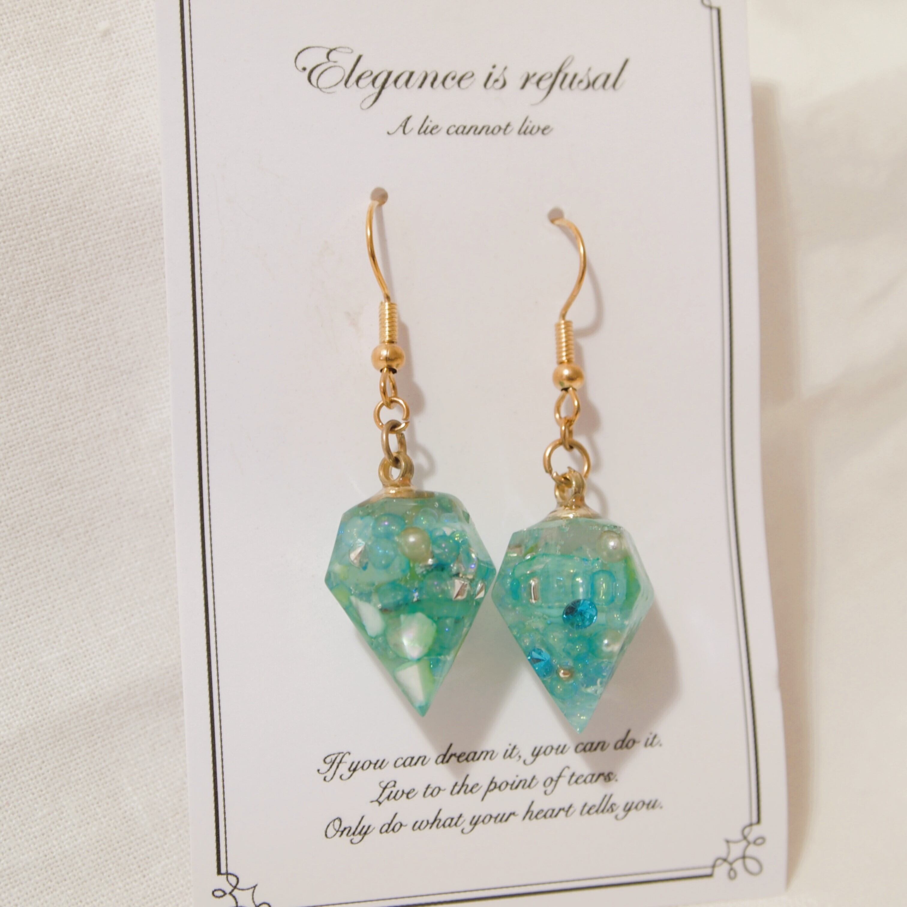 宝石形のトップにグリーンカラー系のシェルやパールを閉じ込めた、大人かわいいデザインです。