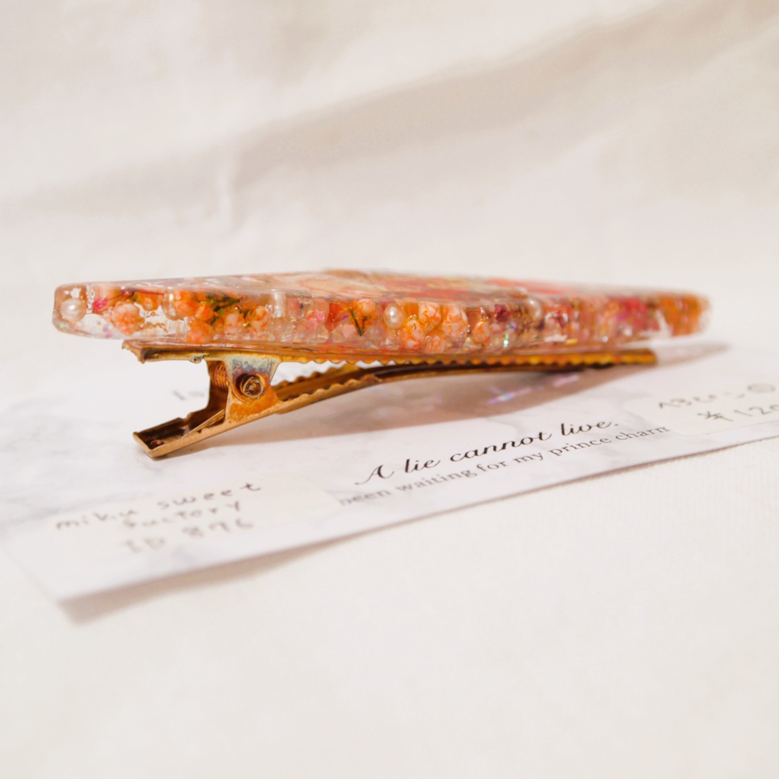 ひし形フレームに暖色系のドライフラワーとパールを閉じ込めた、大人かわいいデザインです。