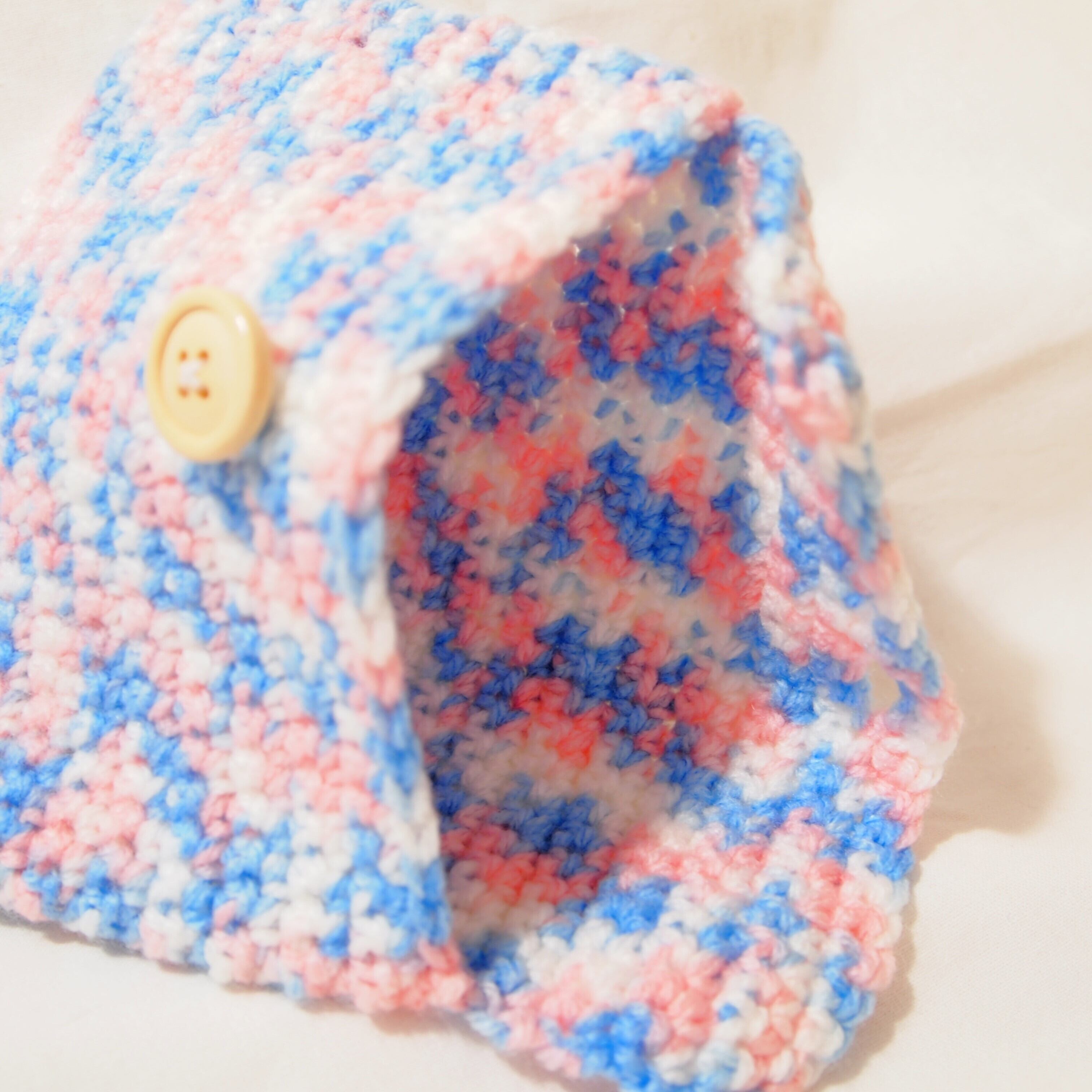 アクリル毛糸を100%使用した、明るい色合いの毛糸のぺたんこポーチです。