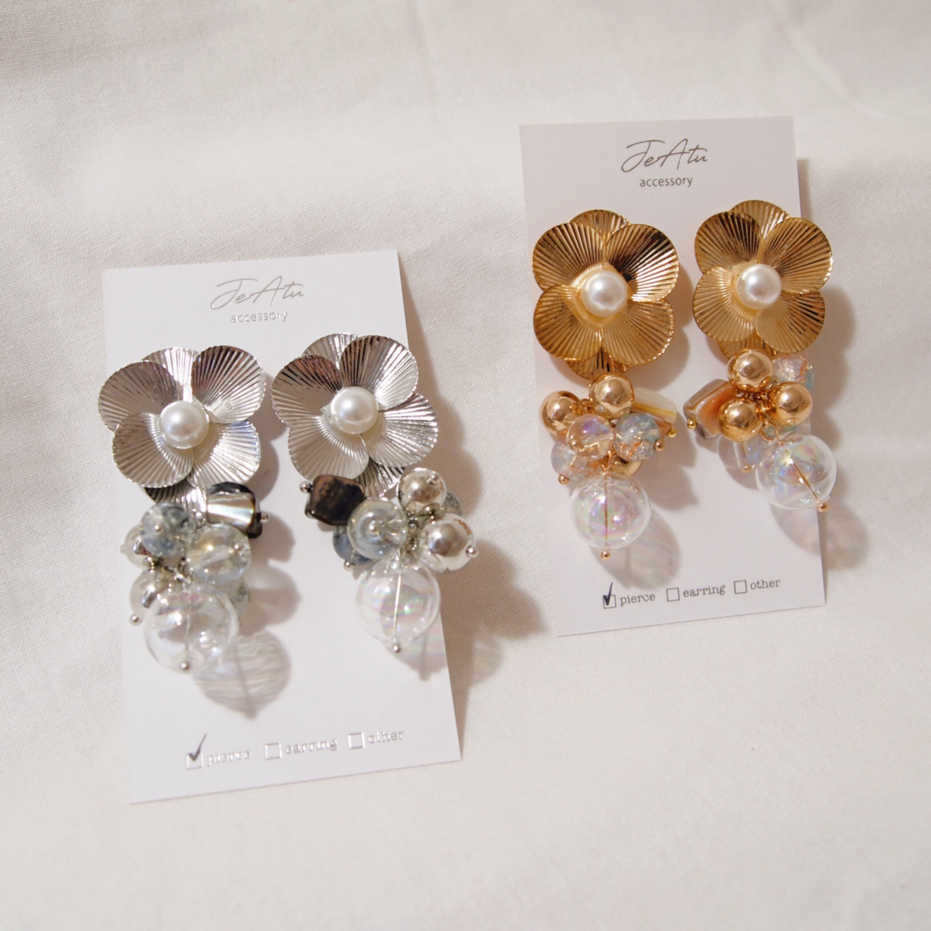 トップに大き目なメタルフラワーを使用し、下にはシェルやメタルビーズ、ガラスドームビーズなどのつぶつぶが揺れる、大人かわいいデザインです。