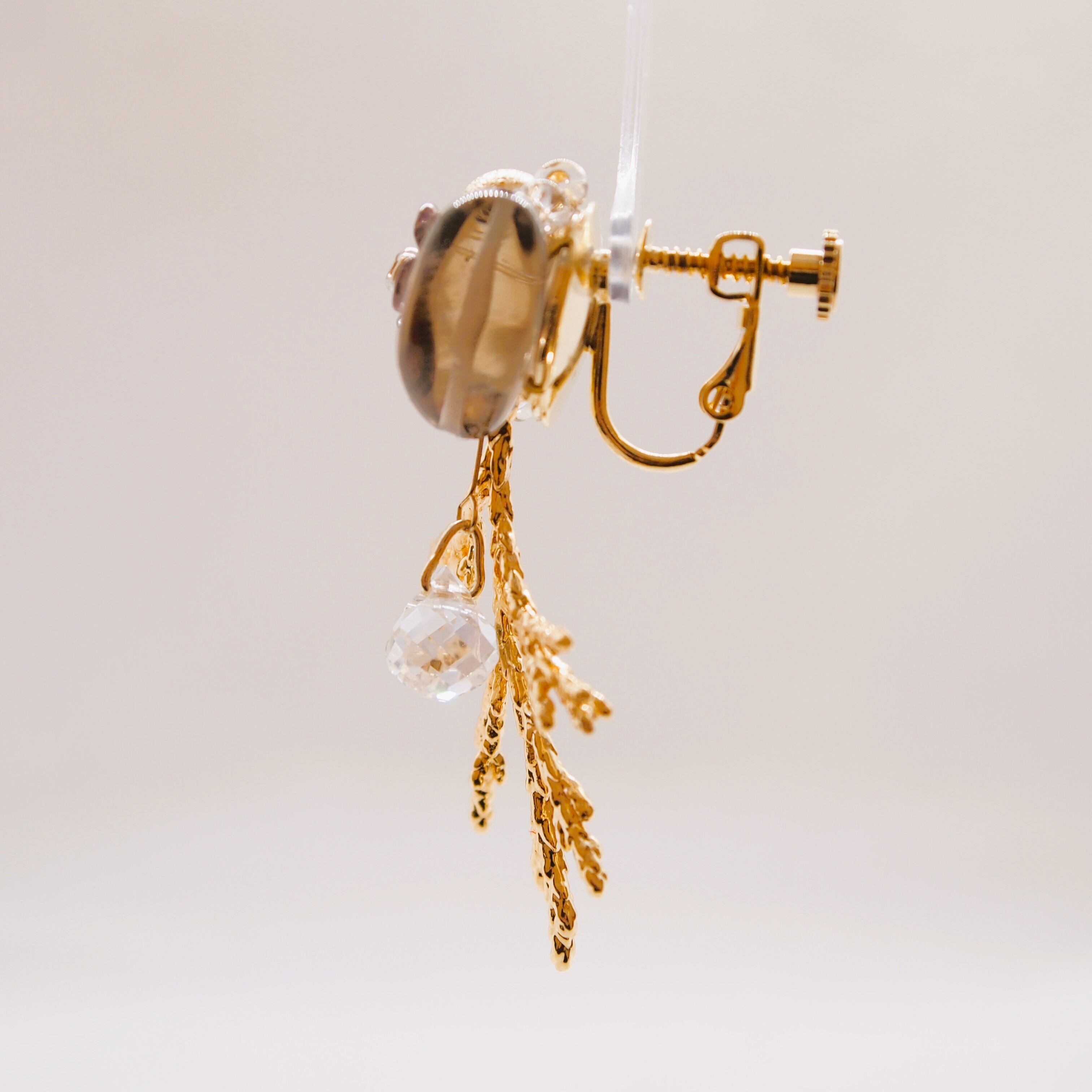 トップのシャワー台にスモーキークォーツやラフタンブル、コットンパール、お花ビーズを編み込み、下にはクリスマスにもピッタリなゴールドの枝パーツを使用した、大人デザインです。